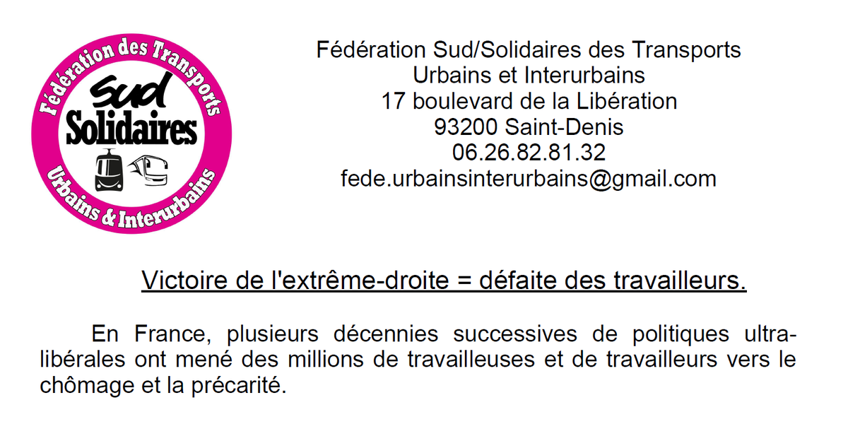 Fédération SUD Solidaires Transports Urbains et Interurbains : Victoire de l'extrême-droite = défaite des travailleurs