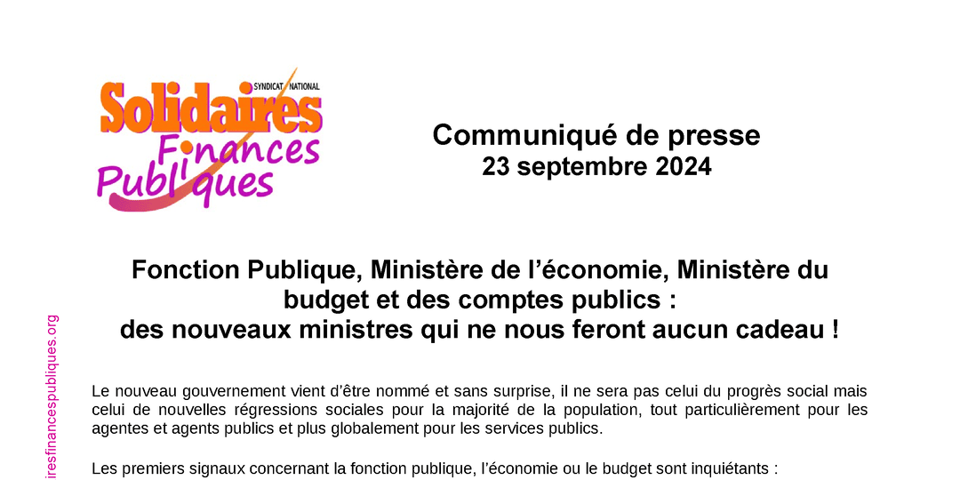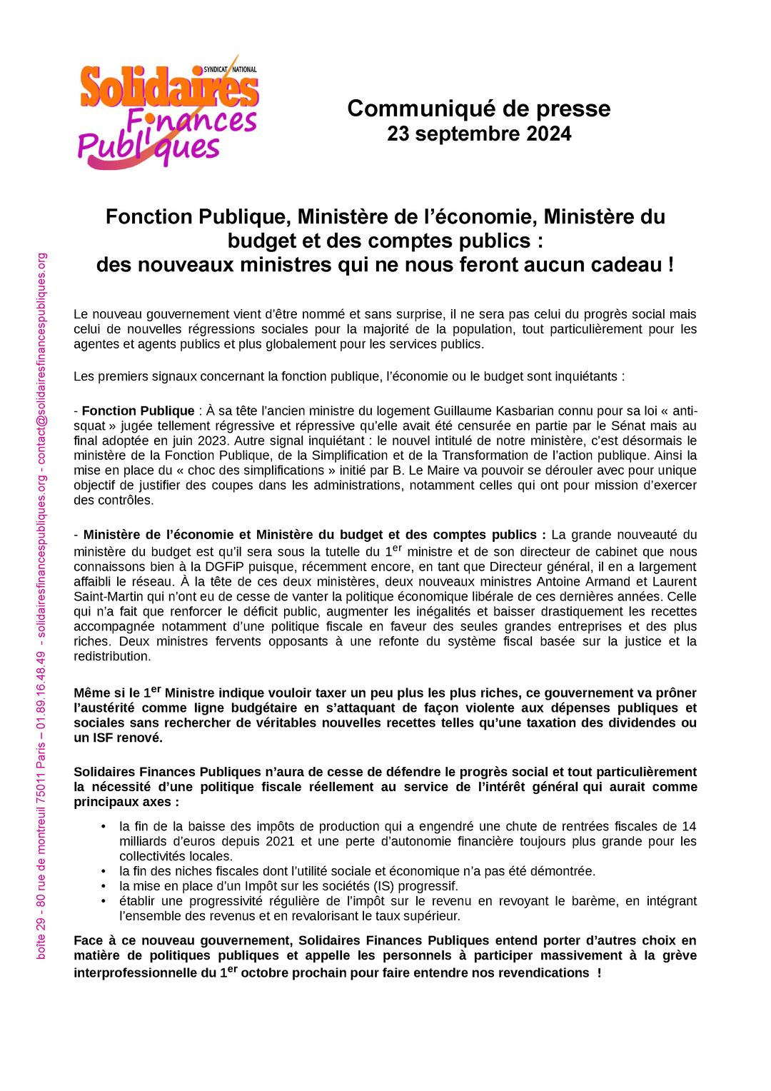 Face à ce nouveau gouvernement, Solidaires Finances Publiques entend porter d’autres choix en matière de politiques publiques et appelle les personnels à participer massivement à la grève interprofessionnelle du 1er octobre prochain pour faire entendre nos revendications  !