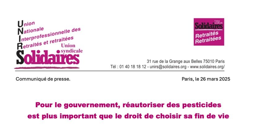 La réunion des présidents de groupes à l’Assemblée nationale a abouti au maintien du calendrier initial. Notons toutefois que ne se sont pas opposés à la proposition gouvernementale les groupes Rassemblement national, UDR et Droite républicaine. L’Union nationale interprofessionnelle des retraité⸳es Solidaires (UNIRS) constate que le gouvernement, la droite et l’extrême droite préfèrent les pesticides aux personnes âgées, qu’ils préfèrent les profits d’une minorité au choix d’une vie digne pour le plus grand nombre. Ce n’est pas la première fois que le Président des très riches nous a montré que lui et ses gouvernements affichent que leurs profits valent plus que nos vies. Faut-il s’en étonner ?