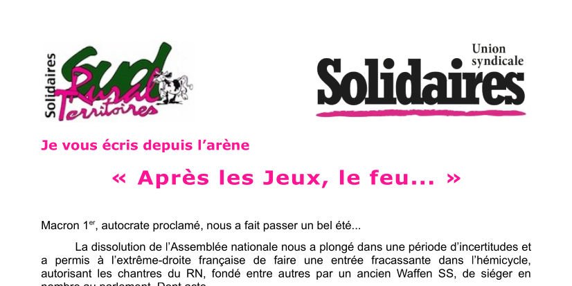 À SUD Rural Territoires, nous n’arrivons pas à courber l’échine devant le maître et ses vassaux. Nous croyons en la force du collectif pour s’opposer à ces dérives politiques ainsi qu’à ces dénis démocratiques, dangereux pour nos droits, nos libertés et notre avenir. La lutte des classes demeure une réalité, notre organisation syndicale reste une solution pour faire front.