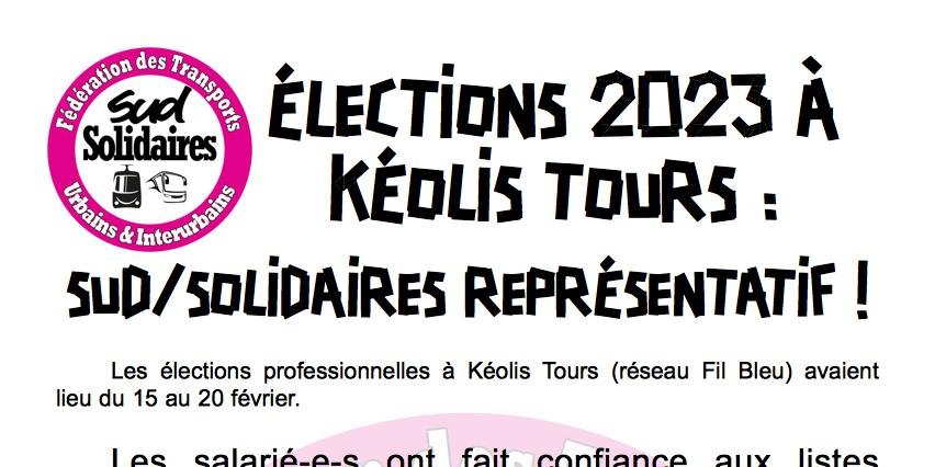 Les résultats des élections professionnelles à Kéolis Tours sont tombés hier dans la soirée : encore un très bon résultat pour la fédération Sud/Solidaires des Transports Urbains et Interurbains !