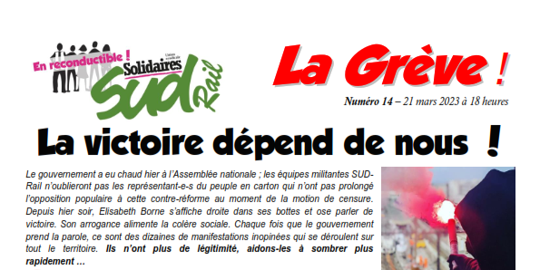 Le gouvernement a eu chaud hier à l’Assemblée nationale ; les équipes militantes SUD-Rail n’oublieront pas les représentant-e-s du peuple en carton qui n’ont pas prolongé l’opposition populaire à cette contre-réforme au moment de la motion de censure. Depuis hier soir, Elisabeth Borne s’affiche droite dans ses bottes et ose parler de victoire. Son arrogance alimente la colère sociale. Chaque fois que le gouvernement prend la parole, ce sont des dizaines de manifestations inopinées qui se déroulent sur tout le territoire. Ils n’ont plus de légitimité, aidons-les à sombrer plus rapidement …