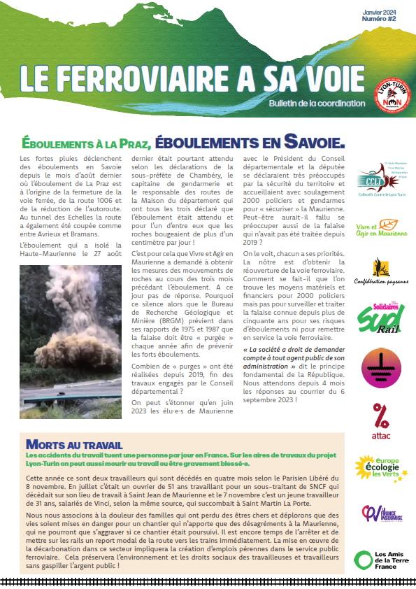 Vous trouverez le numéro 2 du bulletin de la coordination contre le Lyon Turin. Au sommaire du "Ferroviaire a sa voie" :