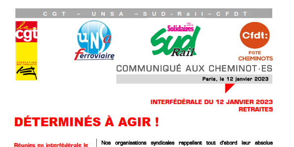 Les fédérations cheminotes CGT - UNSA Ferroviaire - SUD-Rail - CFDT appellent à une mobilisation forte et massive pour le 19 janvier. Ce premier acte sera suivi d’autres mobilisations dans un objectif clair : le retrait de ce mauvais projet de réforme.