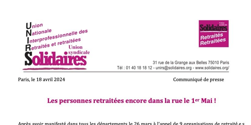 L’UNIRS appelle toutes les personnes en retraite à participer aux manifestations unitaires qui vont se dérouler dans tout le pays le mercredi 1er mai. À Paris, la manifestation, qui regroupera aussi la CFDT et l’UNSA, partira de la Place de la République à 14 heures, pour aller Place de la Nation.