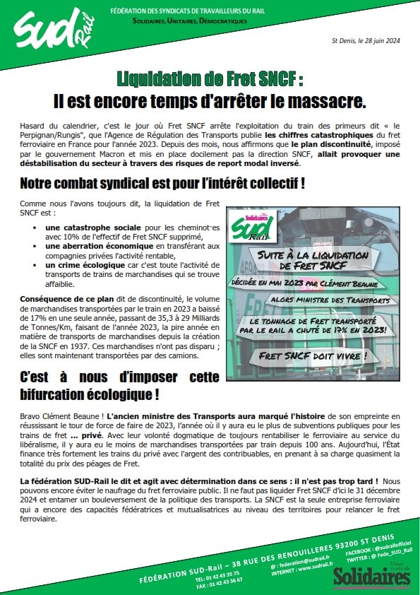 La fédération SUD-Rail le dit et agit avec détermination dans ce sens : il n'est pas trop tard ! Nous pouvons encore éviter le naufrage du fret ferroviaire public. Il ne faut pas liquider Fret SNCF d’ici le 31 décembre 2024 et entamer un bouleversement de la politique des transports. La SNCF est la seule entreprise ferroviaire qui a encore des capacités fédératrices et mutualisatrices au niveau des territoires pour relancer le fret ferroviaire.