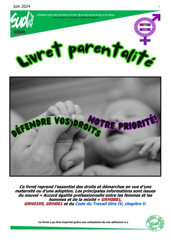 Ce livret réalisé par la fédération SUD-Rail et sa commission Plur'ielles reprend l'essentiel des droits et démarches en vue d'une maternité ou d'une adoption.