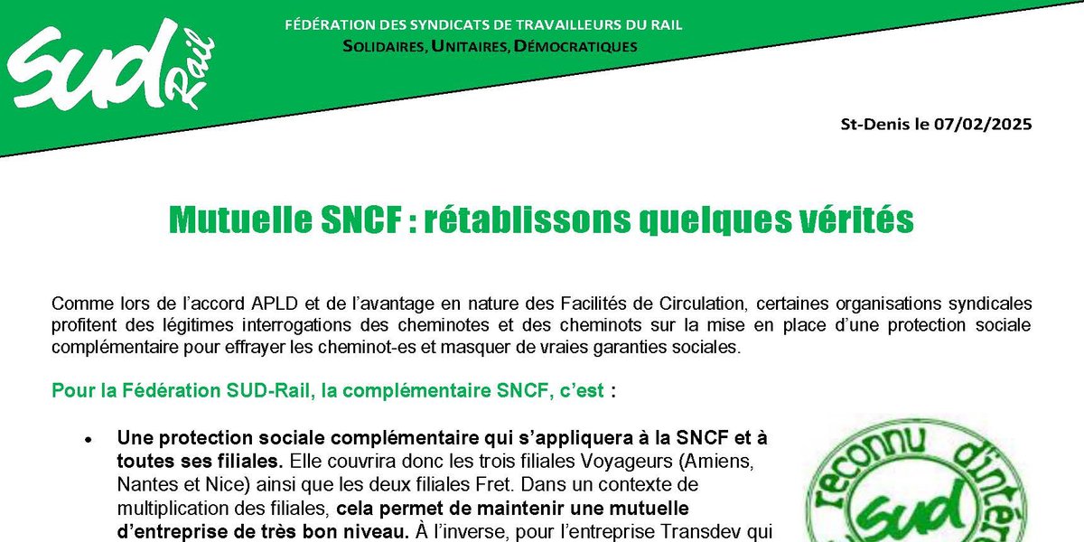La fédération SUD-Rail est bien consciente de la volonté des gouvernements et du patronat de renforcer les positions des opérateurs privés pour financer la santé. Nous ne lâchons pas, pour l’ensemble des travailleuses et travailleurs de ce pays, notre revendication interprofessionnelle concernant le remboursement intégral des frais de santé par la sécurité sociale, seul mécanisme à même d’assurer un égal accès aux soins à un coût mesuré. Mais avec pragmatisme, nous n’adoptons pas uniquement une position de contestation mais aborderons l’ensemble des prochaines négociations/commissions de suivi pour obtenir toujours la meilleure protection sociale complémentaire (PSC) possible en santé et en prévoyance