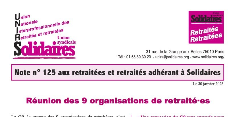 Le G9, le groupe des 9 organisations de retraité·es, s’est réuni le 24 janvier 2025 dans les locaux de la CGT, de 9 h 30 à 12 h, en présence de toutes les organisations, sauf FO et Ensemble & Solidaires excusées. FO absente ne se retrouve pas dans un relevé de décisions d’une réunion à laquelle elle n’a pas assisté. FO n’a pas donné son accord pour la date du 20 mars