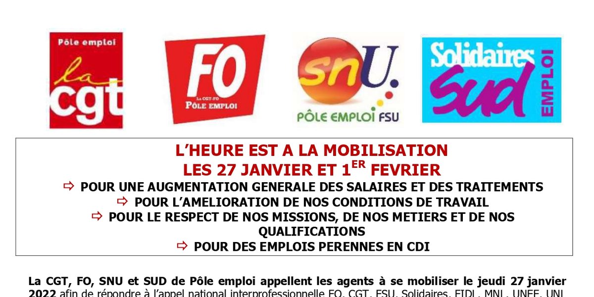 Pôle emploi, pour nos salaires : appel à la grève intersyndicale les 27 janvier et 1er février