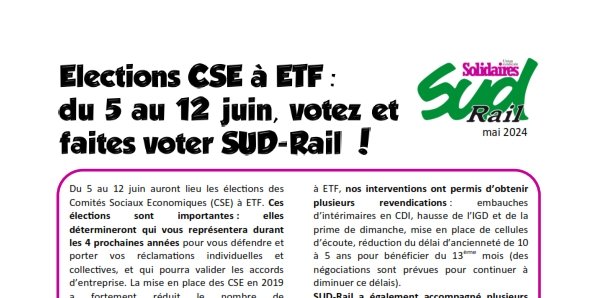 Du 5 au 12 juin auront lieu les élections des Comités Sociaux Economiques (CSE) à ETF. Ces élections à ETF, nos interventions ont permis d’obtenir plusieurs revendications : embauches sont importantes : elles détermineront qui vous représentera durant les 4 prochaines années pour vous défendre et porter vos réclamations individuelles et d’intérimaires en CDI, hausse de l’IGD et de la prime de dimanche, mise en place de cellules d’écoute, réduction du délai d’ancienneté de 10 à 5 ans pour bénéficier du 13ème mois (des collectives, et qui pourra valider les accords négociations sont prévues pour continuer à d’entreprise.