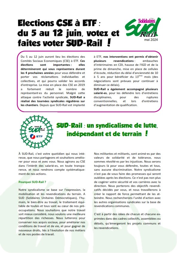La mise en place des CSE en 2019 a fortement réduit le nombre de représentant·es du personnel. Malgré cette attaque contre l’activité syndicale, SUD-Rail a réalisé des tournées syndicales régulières sur les chantiers. Depuis que SUD-Rail est implanté diminuer ce délais).
