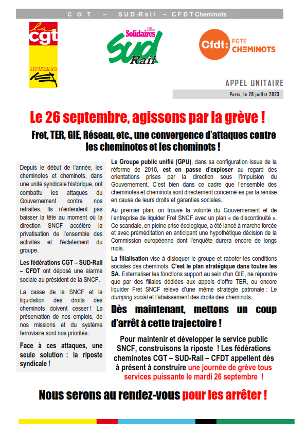 Les fédérations CGT – SUD-Rail – CFDT ont déposé une alarme sociale au président de la SNCF. La casse de la SNCF et la liquidation des droits des cheminots doivent cesser !
