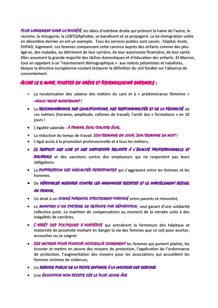 Alors le 8 mars, toustes en grève et Revendiquons ensemble :