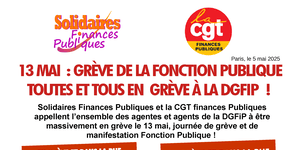Solidaires Finances Publiques et la CGT finances Publiques appellent l’ensemble des agentes et agents de la DGFiP à être massivement en grève le 13 mai, journée de grève et de manifestation Fonction Publique !