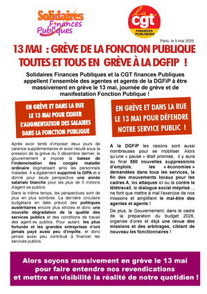 [Tract intersyndical ] 13 mai : Grève de la Fonction Publique. Toutes et tous en Grève à la DGFiP !