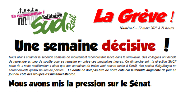 Nous allons entamer la seconde semaine de mouvement reconductible lancé dans le ferroviaire. Des collègues ont décidé de reprendre un peu de souffle pour se remettre en grève ces prochaines heures. Ce dimanche soir, la direction SNCF parle de « nette amélioration » alors que des centaines de trains vont encore rester à l’arrêt, des postes d’aiguillages ne seront ouverts qu’aux heures de pointes ... Le doute ne doit pas être de notre côté car la fébrilité augmente de jour en jour du côté des troupes d’Emmanuel Macron.