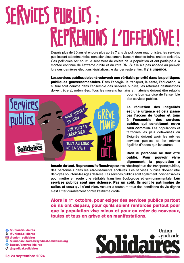 Alors le 1er octobre, pour exiger des services publics partout où ils ont disparu, pour qu’ils soient renforcés partout pour que la population vive mieux et pour en créer de nouveaux, toutes et tous en grève et en manifestations.