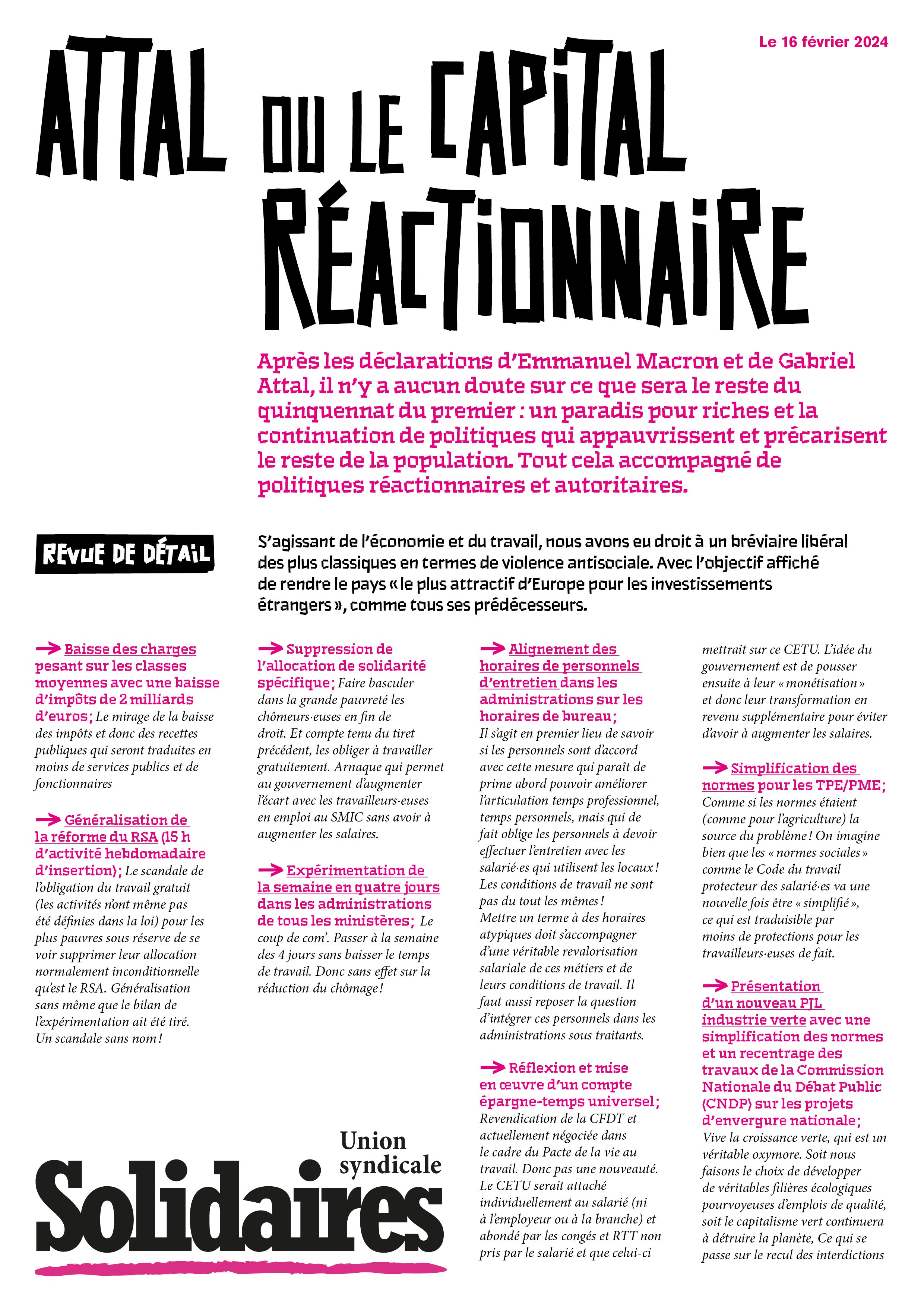 Pour l’Union syndicale Solidaires, ce sont des politiques de satisfaction des besoins sociaux et luttant contre toute forme de précarité et de discrimination dont les travailleur·euses ont urgement besoin. Des politiques permettant une répartition plus juste des richesses et respectueuses de l’environnement. Des politiques pour une protection sociale assurant une meilleure égalité réelle entre toutes et tous. C’est pour les imposer que nous construisons le rapport de force.