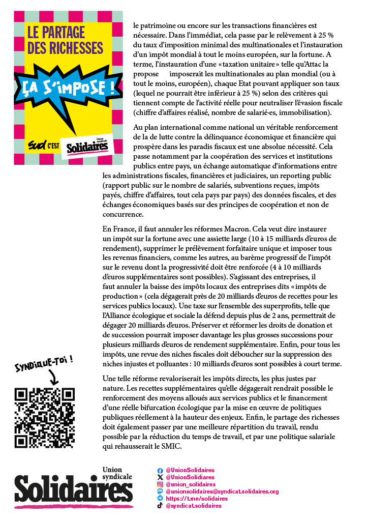 Une telle réforme revaloriserait les impôts directs, les plus justes par nature. Les recettes supplémentaires qu’elle dégagerait rendrait possible le renforcement des moyens alloués aux services publics et le financement d’une réelle bifurcation écologique par la mise en œuvre de politiques publiques réellement à la hauteur des enjeux. Enfin, le partage des richesses doit également passer par une meilleure répartition du travail, rendu possible par la réduction du temps de travail, et par une politique salariale qui rehausserait le SMIC.