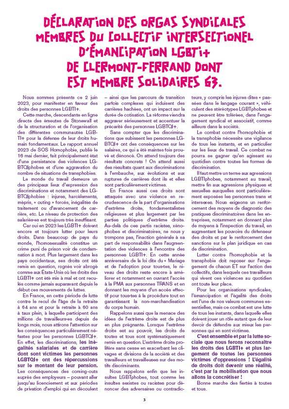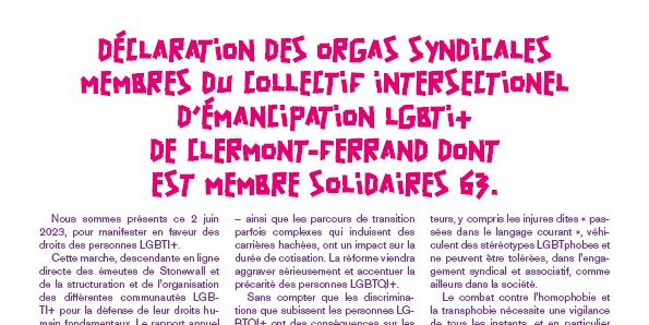 Déclaration des orgas syndicales membres du Collectif Intersectionel d'Émancipation LGBTI+ de Clermont-Ferrand dont est membre Solidaires 63.