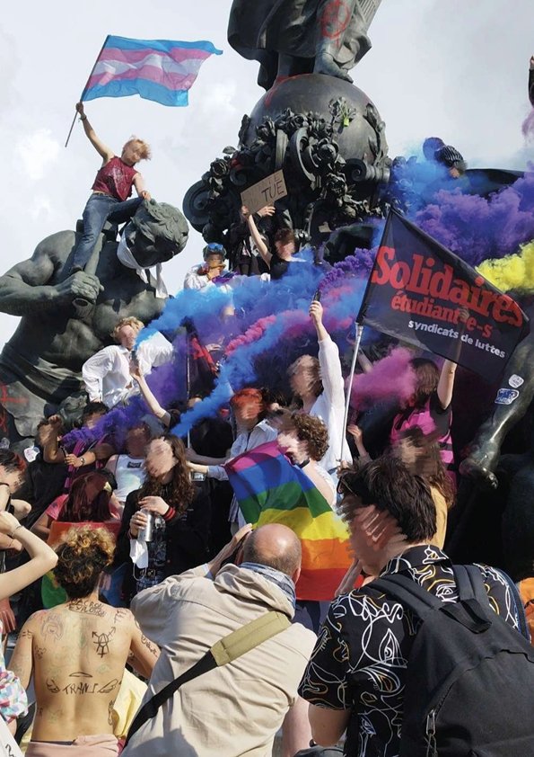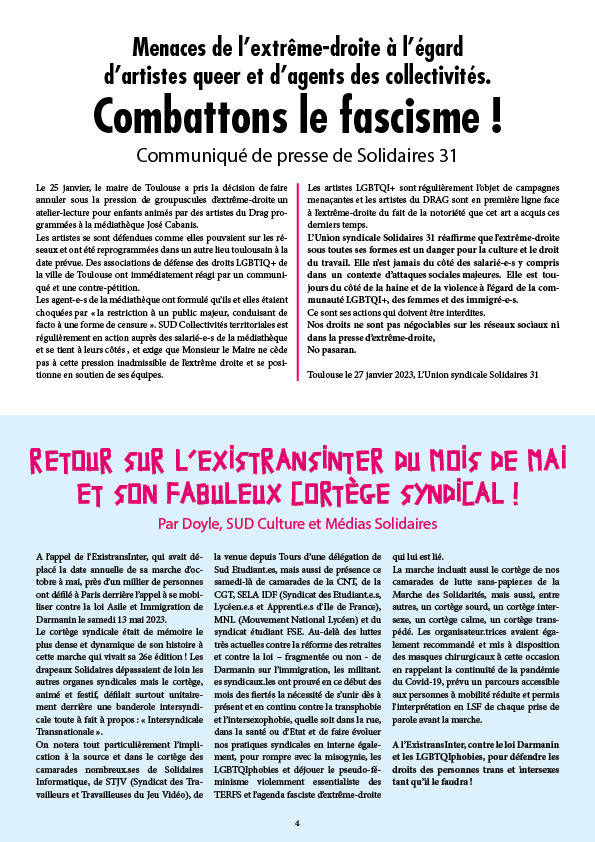 On notera tout particulièrement l’implication à la source et dans le cortège des camarades nombreux.ses de Solidaires Informatique, de STJV (Syndicat des Travailleurs et Travailleuses du Jeu Vidéo), de la venue depuis Tours d’une délégation de Sud Etudiant.es, mais aussi de présence ce samedi-là de camarades de la CNT, de la CGT, SELA IDF (Syndicat des Etudiant.e.s, Lycéen.e.s et Apprenti.e.s d'Ile de France), MNL (Mouvement National Lycéen) et du syndicat étudiant FSE. Au-delà des luttes très actuelles contre la réforme des retraites et contre la loi – fragmentée ou non - de Darmanin sur l’immigration, les militant.es syndicaux.les ont prouvé en ce début des mois des fiertés la nécessité de s’unir dès à présent et en continu contre la transphobie et l’intersexophobie, quelle soit dans la rue, dans la santé ou d’Etat et de faire évoluer nos pratiques syndicales en interne également, pour rompre avec la misogynie, les LGBTQIphobies et déjouer le pseudo-féminisme violemment essentialiste des TERFS et l’agenda fasciste d’extrême-droite qui lui est lié.