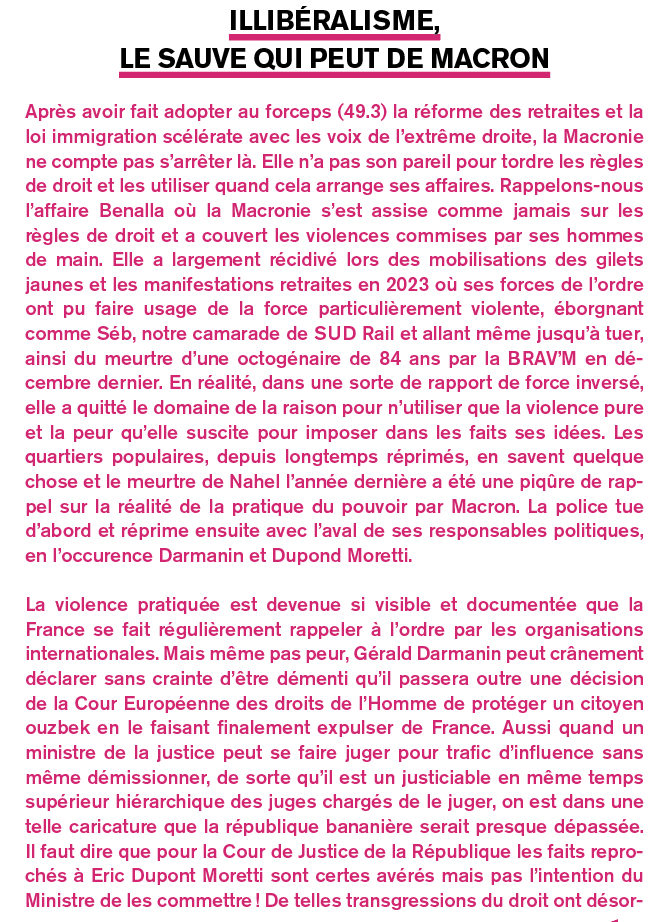 Après avoir fait adopter au forceps (49.3) la réforme des retraites et la loi immigration scélérate avec les voix de l’extrême droite, la Macronie ne compte pas s’arrêter là. Elle n’a pas son pareil pour tordre les règles de droit et les utiliser quand cela arrange ses affaires. Rappelons-nous l’affaire Benalla où la Macronie s’est assise comme jamais sur les règles de droit et a couvert les violences commises par ses hommes de main. Elle a largement récidivé lors des mobilisations des gilets jaunes et les manifestations retraites en 2023 où ses forces de l’ordre ont pu faire usage de la force particulièrement violente, éborgnant comme Séb, notre camarade de SUD Rail et allant même jusqu’à tuer, ainsi du meurtre d’une octogénaire de 84 ans par la BRAV’M en décembre dernier. En réalité, dans une sorte de rapport de force inversé, elle a quitté le domaine de la raison pour n’utiliser que la violence pure et la peur qu’elle suscite pour imposer dans les faits ses idées. Les quartiers populaires, depuis longtemps réprimés, en savent quelque chose et le meurtre de Nahel l’année dernière a été une piqûre de rappel sur la réalité de la pratique du pouvoir par Macron. La police tue d’abord et réprime ensuite avec l’aval de ses responsables politiques, en l’occurence Darmanin et Dupond Moretti.