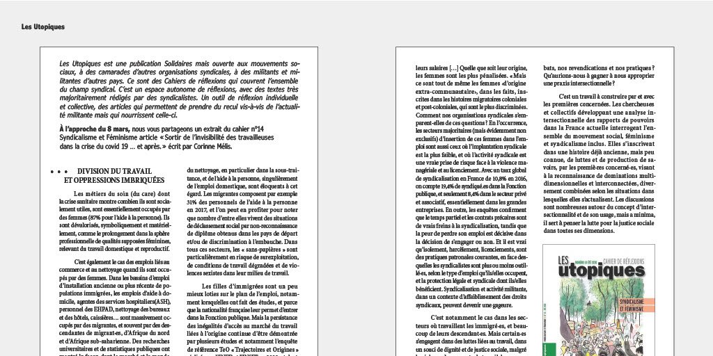 Les Utopiques est une publication Solidaires mais ouverte aux mouvements sociaux, à des camarades d’autres organisations syndicales, à des militants et militantes d’autres pays. Ce sont des Cahiers de réflexions qui couvrent l’ensemble du champ syndical. C'est un espace autonome de réflexions, avec des textes très majoritairement rédigés par des syndicalistes. Un outil de réflexion individuelle et collective, des articles qui permettent de prendre du recul vis-à-vis de l’actualité militante mais qui nourrissent celle-ci.