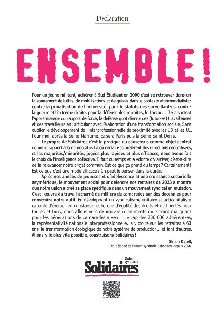Pour moi, après la Seine-Maritime, ce sera Paris puis la Seine-Saint-Denis. Le propre de Solidaires c’est la pratique du consensus comme objet central de notre rapport à la démocratie. Là où certain·es préfèrent des directions centralisées, et les majorités/minorités, jugées plus rapides et plus efficaces, nous avons fait le choix de l’intelligence collective. Il faut du temps et la volonté d’y arriver, c’est-à-dire de faire avancer notre projet commun.