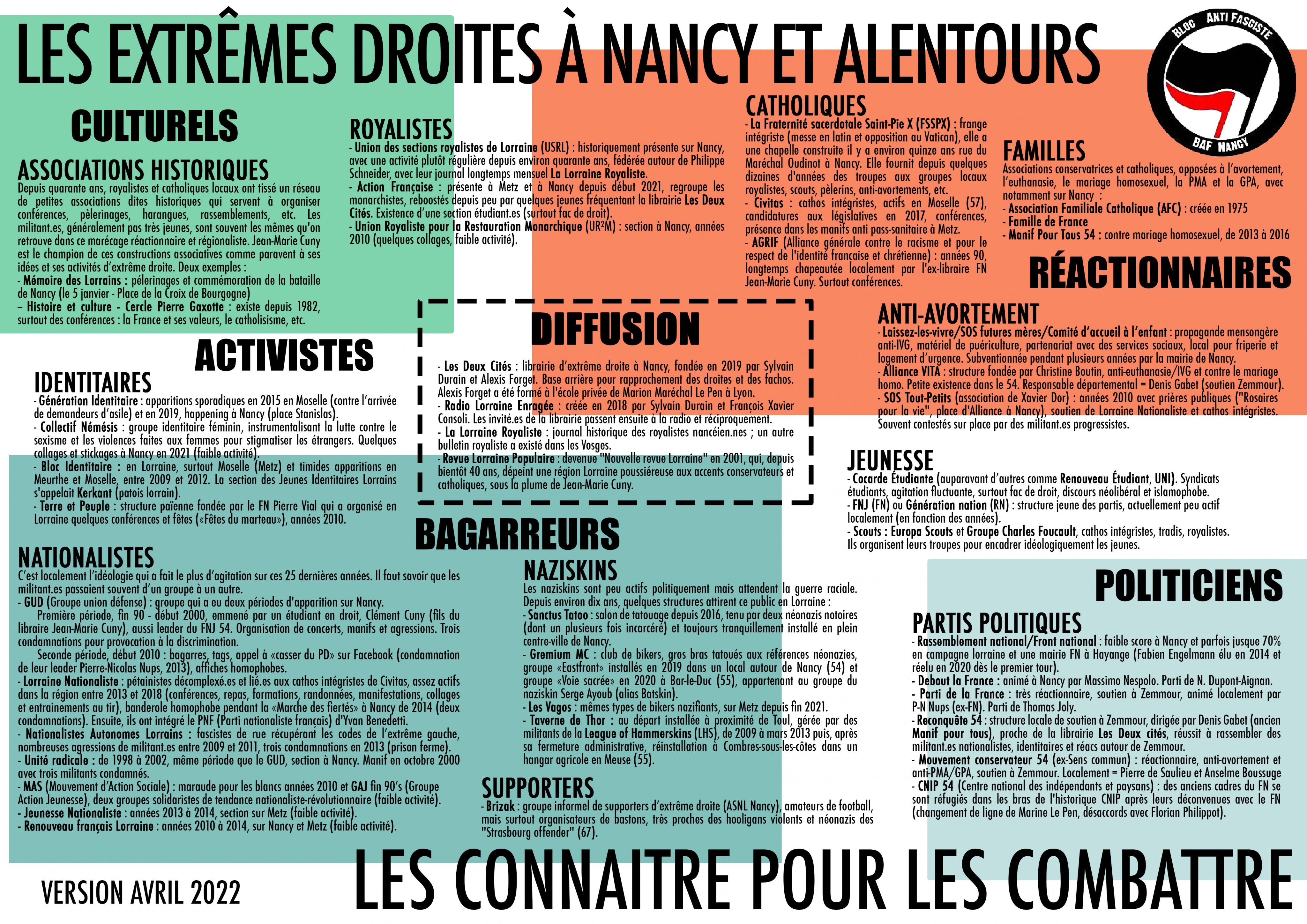 Depuis seulement un an, le boulot abattu est non négligeable : plusieurs tractages et présences aux manifestations écolos, antifas, pacifistes ou sociales, à Nancy ou aussi en soutien aux voisin·es antifas de Metz, de Reims ou de Strasbourg ; deux AG antifascistes (50-100 personnes à chaque fois) pour construire de manière encore plus large une riposte contre l'extrême droite ; collages et décollages inter-orgas, stickage et manifestation, création d'une liste de diffusion pour partager les infos locales antifas, soirée-concert, mobilisations contre la librairie nancéienne d'extrême droite, tractages, créations d'affiches et de visuels, etc.