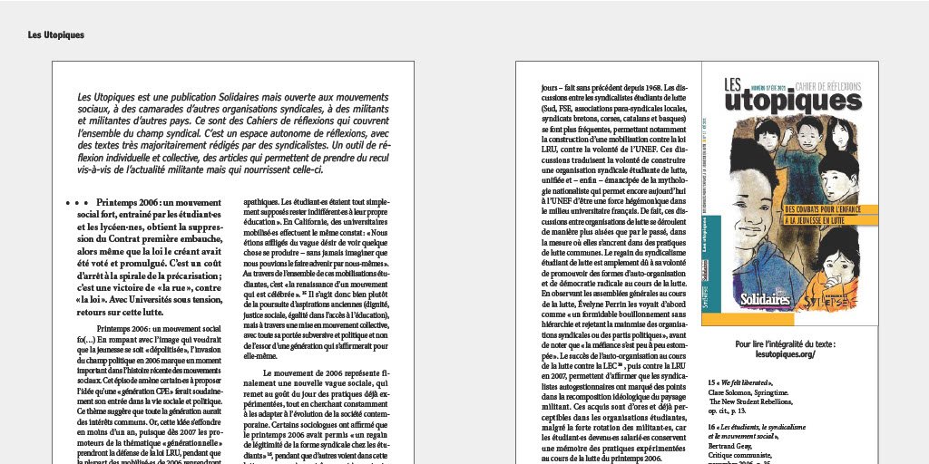 Les Utopiques est une publication Solidaires mais ouverte aux mouvements sociaux, à des camarades d’autres organisations syndicales, à des militants et militantes d’autres pays. Ce sont des Cahiers de réflexions qui couvrent l’ensemble du champ syndical. C'est un espace autonome de réflexions, avec des textes très majoritairement rédigés par des syndicalistes. Un outil de réflexion individuelle et collective, des articles qui permettent de prendre du recul vis-à-vis de l’actualité militante mais qui nourrissent celle-ci.