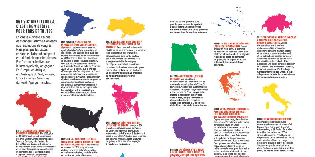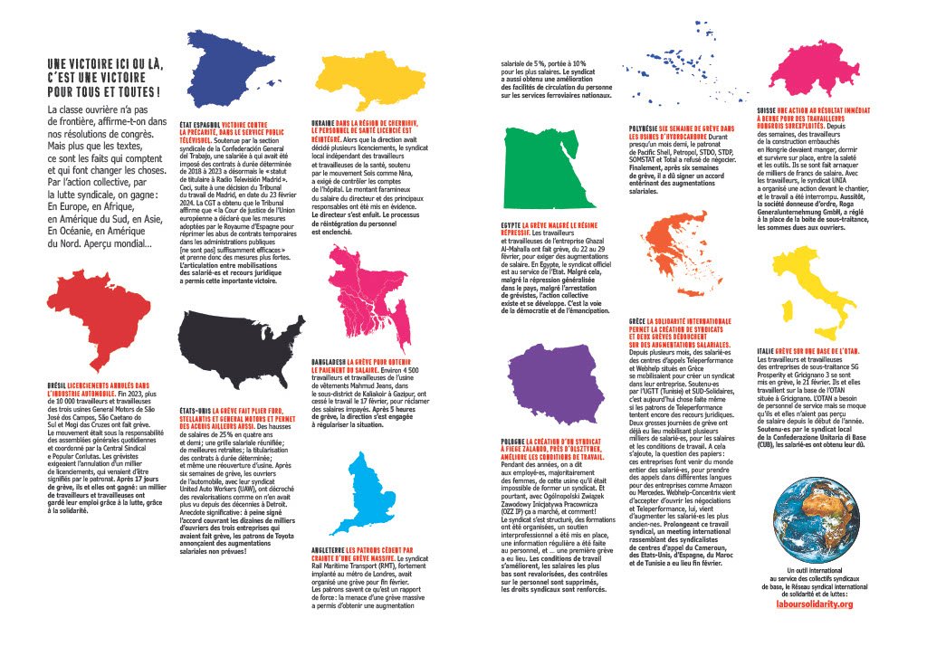 La classe ouvrière n’a pas de frontière, affirme-t-on dans nos résolutions de congrès. Mais plus que les textes, ce sont les faits qui comptent et qui font changer les choses. Par l’action collective, par la lutte syndicale, on gagne : En Europe, en Afrique, en Amérique du Sud, en Asie, En Océanie, en Amérique du Nord. Aperçu mondial…