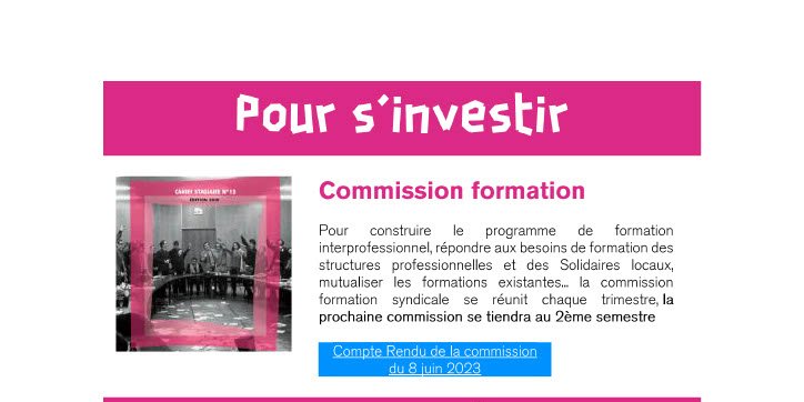 Pour construire le programme de formation interprofessionnel, répondre aux besoins de formation des structures professionnelles et des Solidaires locaux, mutualiser les formations existantes... la commission formation syndicale se réunit chaque trimestre, la prochaine commission se tiendra au 2ème semestre Compte Rendu de la commission