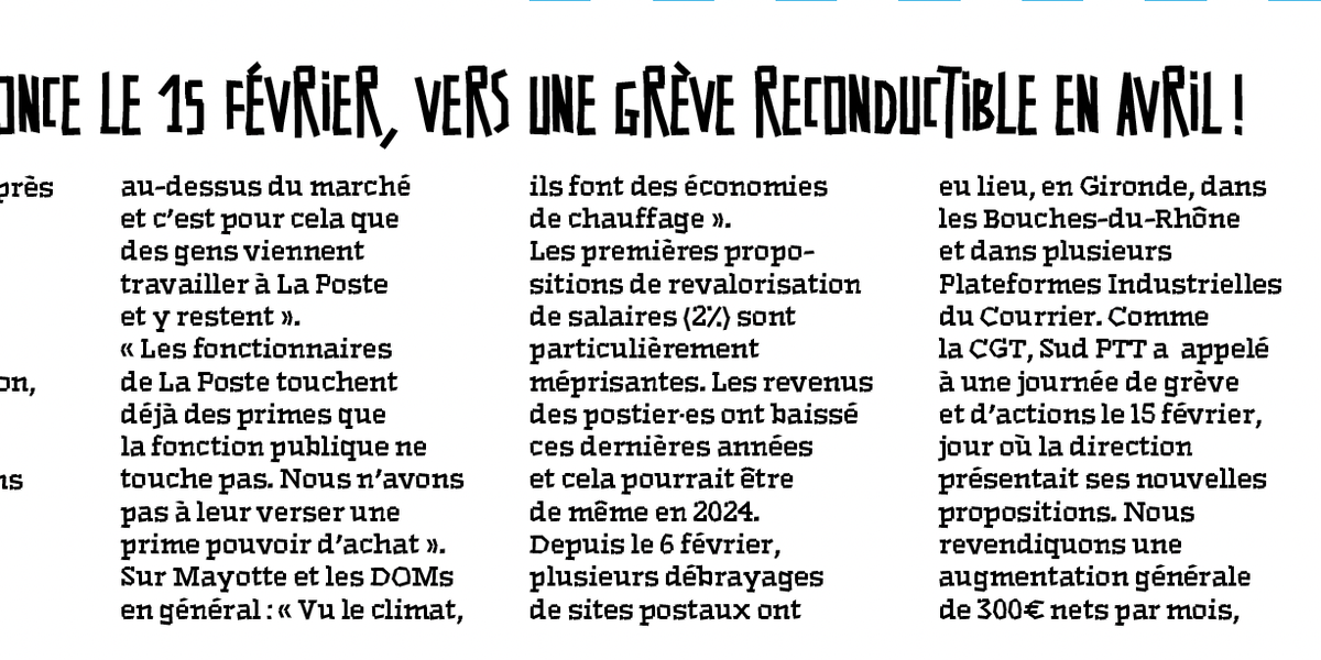 Depuis le 6 février, plusieurs débrayages de sites postaux ont eu lieu, en Gironde, dans les Bouches-du-Rhône et dans plusieurs Plateformes Industrielles du Courrier. Comme la CGT, Sud PTT a appelé à une journée de grève et d’actions le 15 février, jour où la direction présentait ses nouvelles propositions.