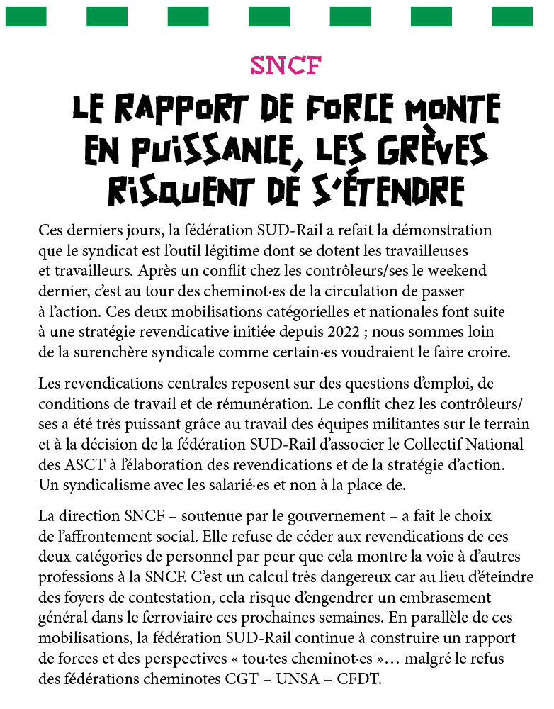 La direction SNCF – soutenue par le gouvernement – a fait le choix de l’affrontement social. Elle refuse de céder aux revendications de ces deux catégories de personnel par peur que cela montre la voie à d’autres professions à la SNCF. C’est un calcul très dangereux car au lieu d’éteindre des foyers de contestation, cela risque d’engendrer un embrasement général dans le ferroviaire ces prochaines semaines. En parallèle de ces mobilisations, la fédération SUD-Rail continue à construire un rapport de forces et des perspectives « tou·tes cheminot·es » … malgré le refus des fédérations cheminotes CGT – UNSA – CFDT.