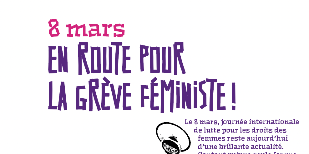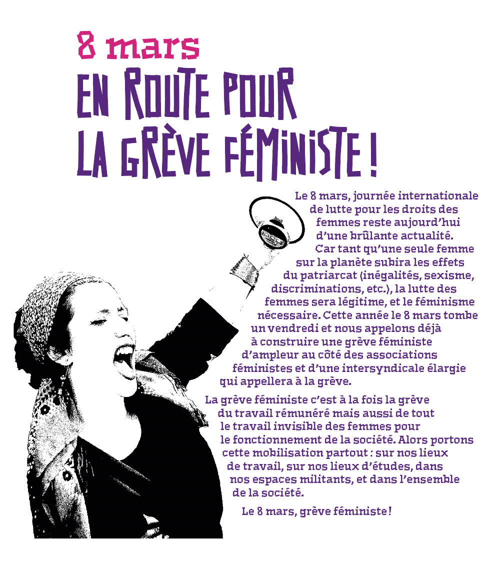 Le 8 mars, journée internationale de lutte pour les droits des femmes reste aujourd’hui d’une brûlante actualité. Car tant qu’une seule femme sur la planète subira les effets du patriarcat (inégalités, sexisme, discriminations, etc.), la lutte des femmes sera légitime, et le féminisme nécessaire. Cette année le 8 mars tombe un vendredi et nous appelons déjà à construire une grève féministe d’ampleur au côté des associations féministes et d’une intersyndicale élargie qui appellera à la grève.