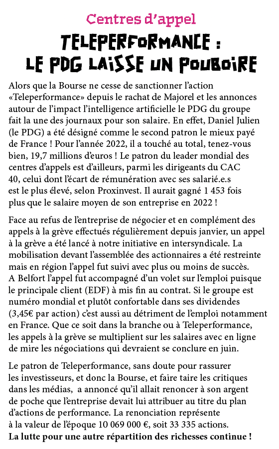 A Belfort l’appel fut accompagné d’un volet sur l’emploi puisque le principale client (EDF) à mis fin au contrat. Si le groupe est numéro mondial et plutôt confortable dans ses dividendes (3,45€ par action) c’est aussi au détriment de l’emploi notamment en France. Que ce soit dans la branche ou à Teleperformance, les appels à la grève se multiplient sur les salaires avec en ligne de mire les négociations qui devraient se conclure en juin.