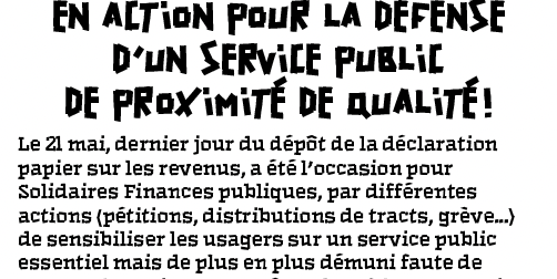 Le 21 mai, dernier jour du dépôt de la déclaration papier sur les revenus, a été l’occasion pour Solidaires Finances publiques, par différentes actions (pétitions, distributions de tracts, grève...) de sensibiliser les usagers sur un service public essentiel mais de plus en plus démuni faute de moyens humain,tout en répondant à leurs questions concernant leur déclaration. A Dole (39) ,18 agents sur 24 étaient en grève, obligeant ainsi la direction locale à décaler la date de dépôt de la déclaration papier. Ces actions ont permis de rappeler que le service public des finances publiques était celui des usagers et qu’il était urgent de le défendre, le renforcer, le développer et le rendre accessible pour toutes et tous !