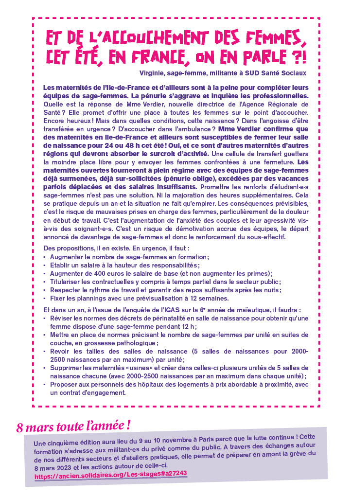 Une cellule de transfert guettera la moindre place libre pour y envoyer les femmes confrontées à une fermeture. Les maternités ouvertes tourneront à plein régime avec des équipes de sage-femmes déjà surmenées, déjà sur-sollicitées (pénurie oblige), excédées par des vacances parfois déplacées et des salaires insuffisants. Promettre les renforts d’étudiant-e-s sage-femmes n’est pas une solution. Ni la majoration des heures supplémentaires. Cela se pratique depuis un an et la situation ne fait qu’empirer.
