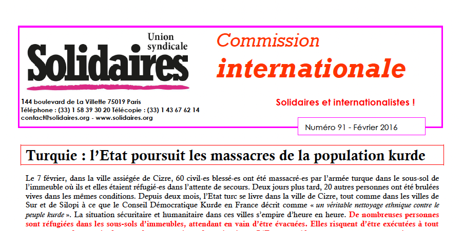 - Turquie : l’Etat poursuit les massacres de la population kurde