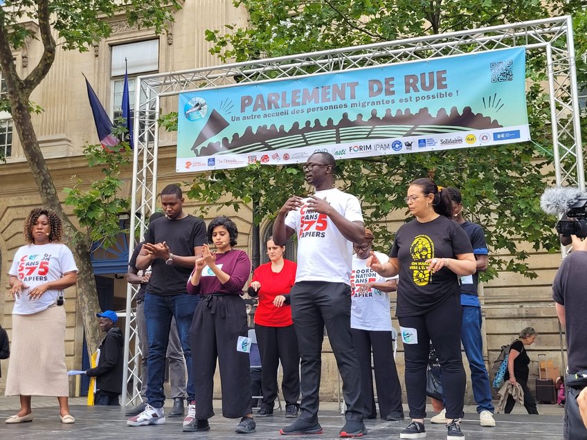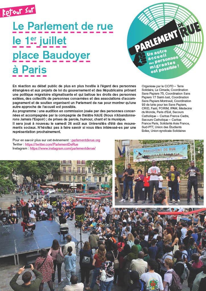 Organisée par le CCFD – Terre Solidaire, La Cimade, Coordination Sans Papiers 75, Coordination Sans Papiers 17 Saint-Just, Coordination Sans Papiers Montreuil, Coordination 93 de lutte pour les Sans Papiers, CRID, Fasti, FORIM, IPAM, Médecins du Monde, Paris d’Exil, Secours Catholique – Caritas France Cedre, Secours Catholique – Caritas France Paris, Solidarité Asie France, Sud-PTT, Union des Étudiants Exilés, Union syndicale Solidaires